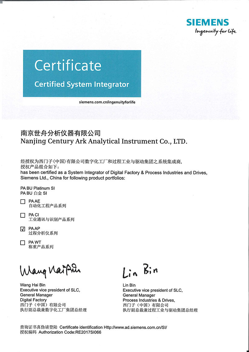 Certified as a PA BU Platinum System Integrator of Siemens China