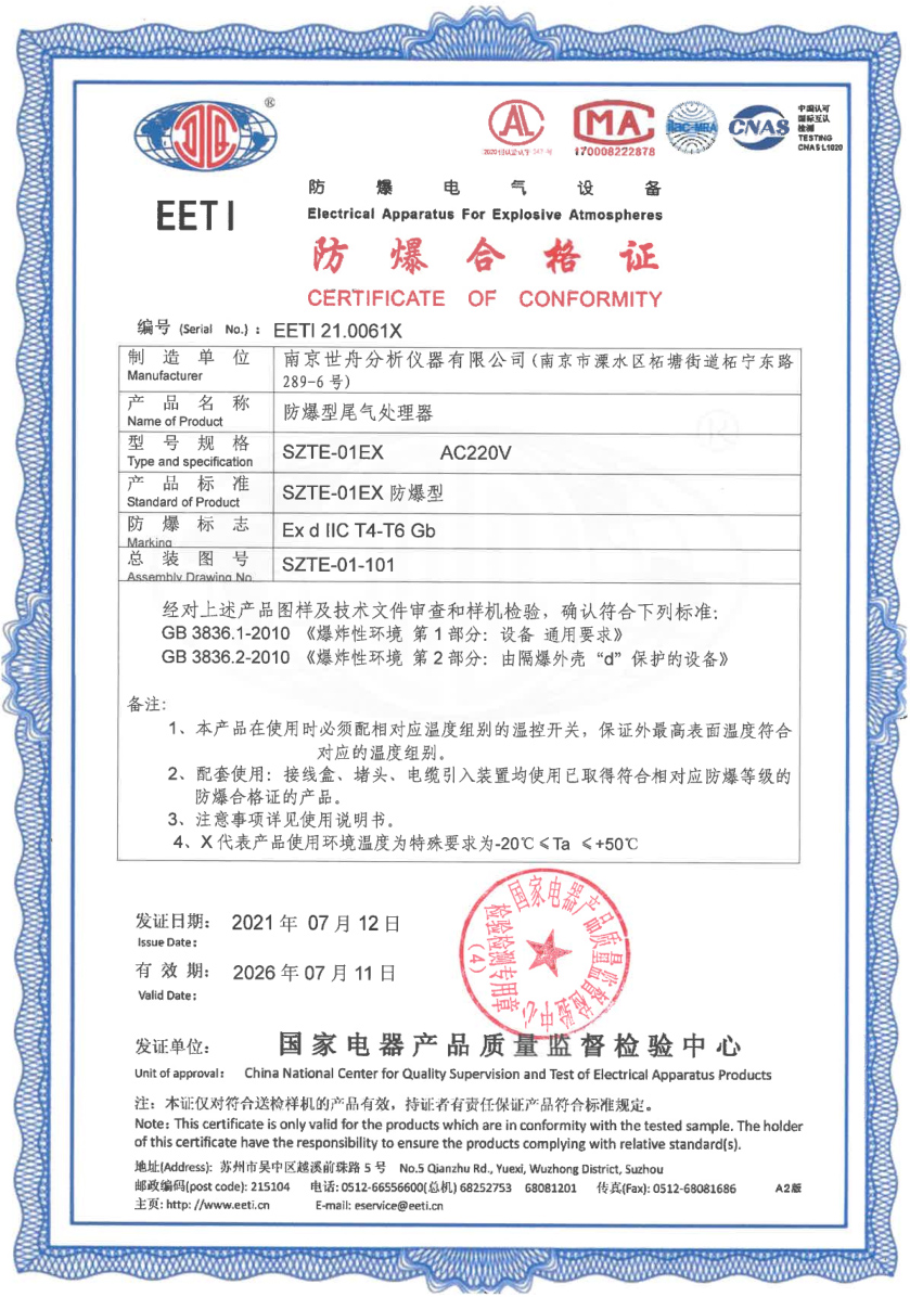 公司新近研发了SZTE-01Ex防爆型尾气处理器获得了由国家电器产品质量监督检验中心颁发的防爆认证证书。