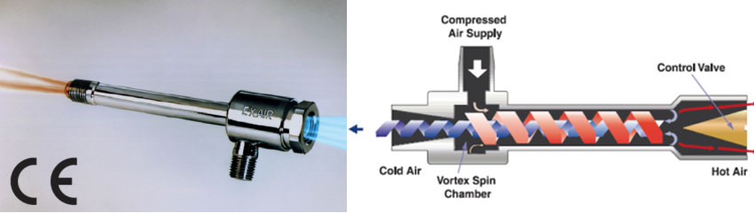 压缩空气进入涡旋发生器产生高速旋转后产生热端和冷端,冷端气流用来冷却各种介质或设备。